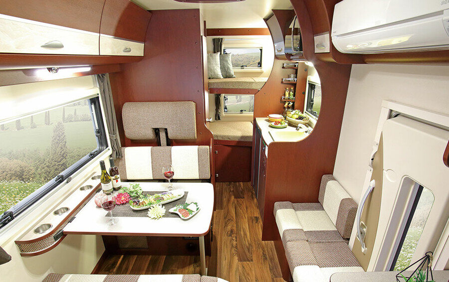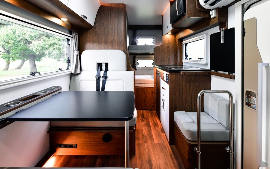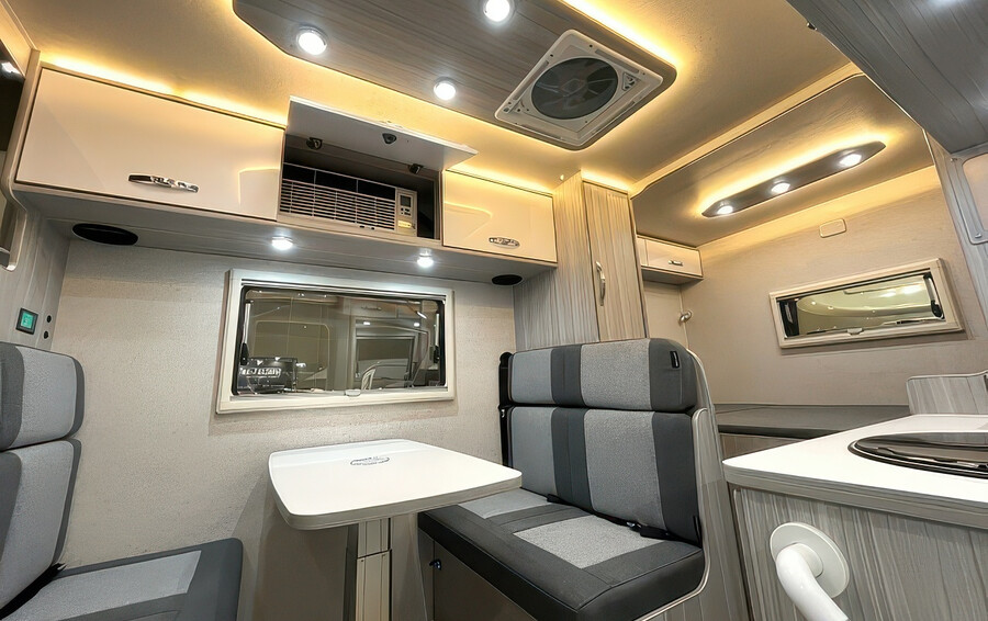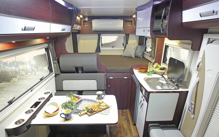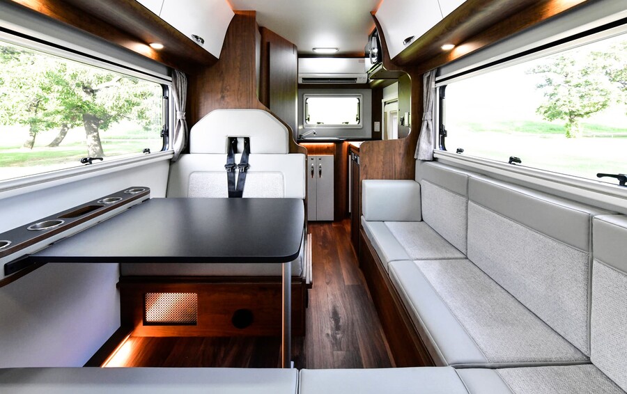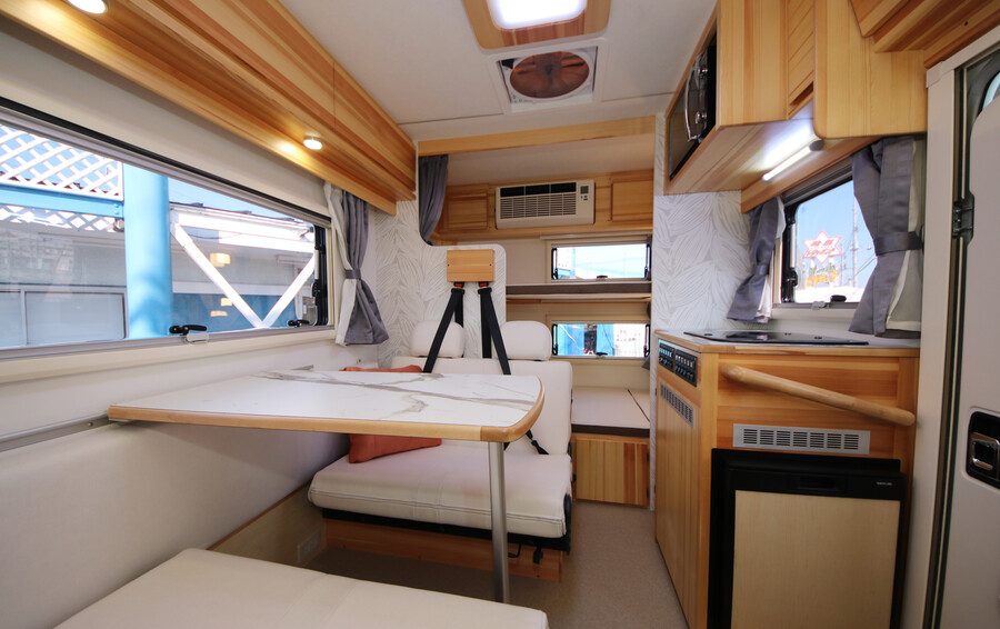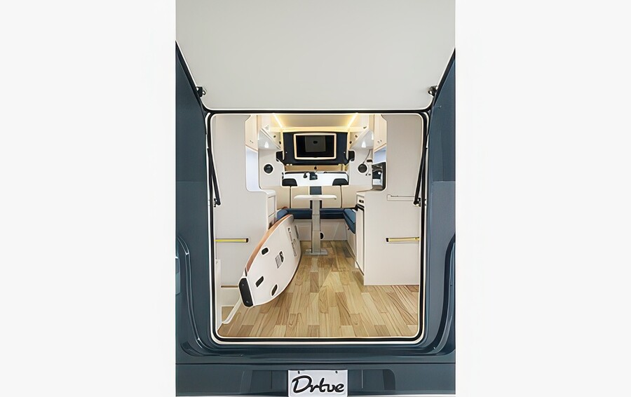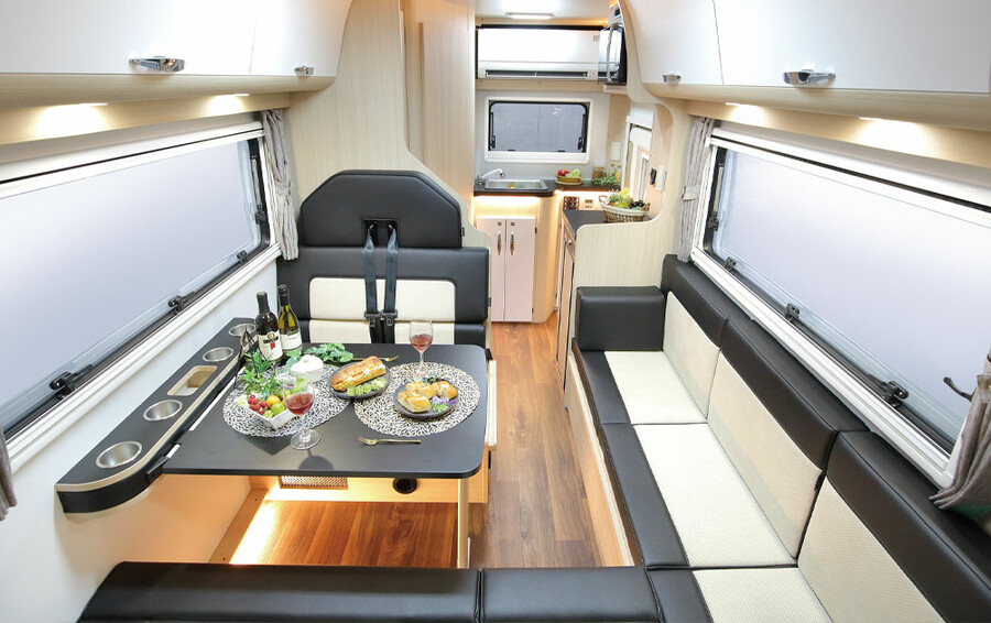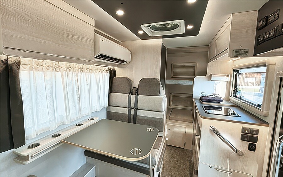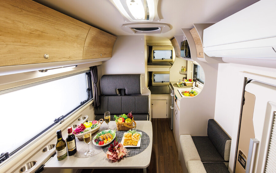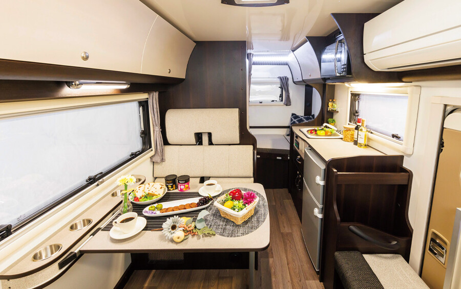 - 内装: 2人掛けマルチアクション式シートや脱着式折りたたみテーブルを備えたリビング。