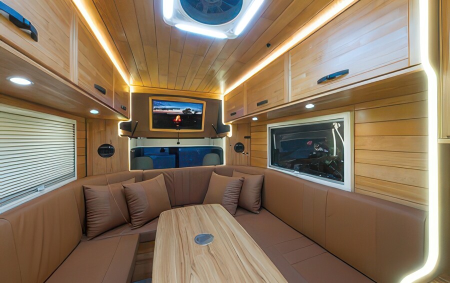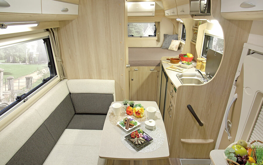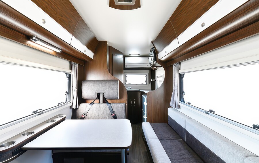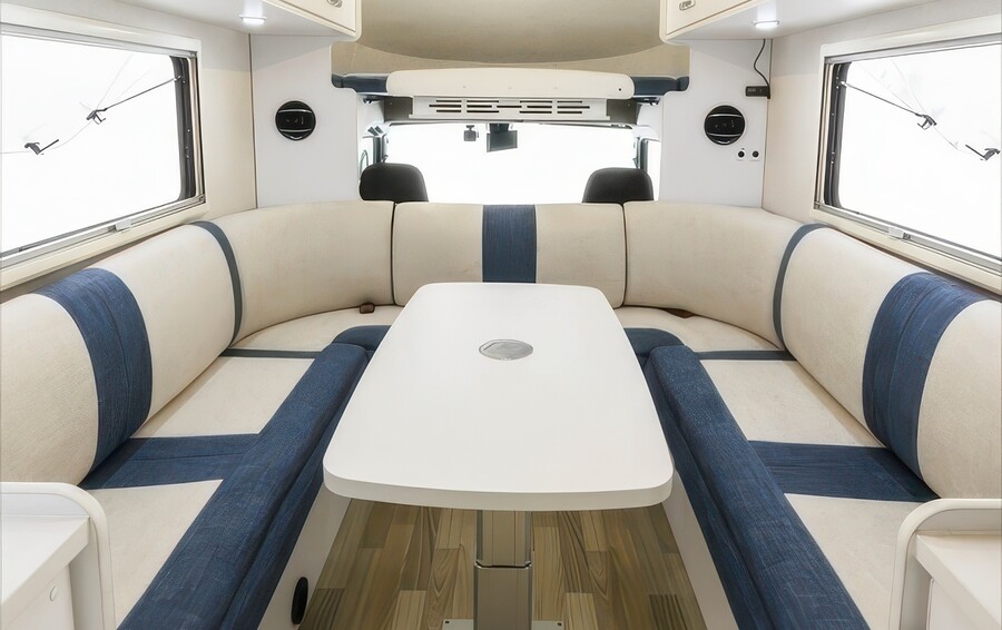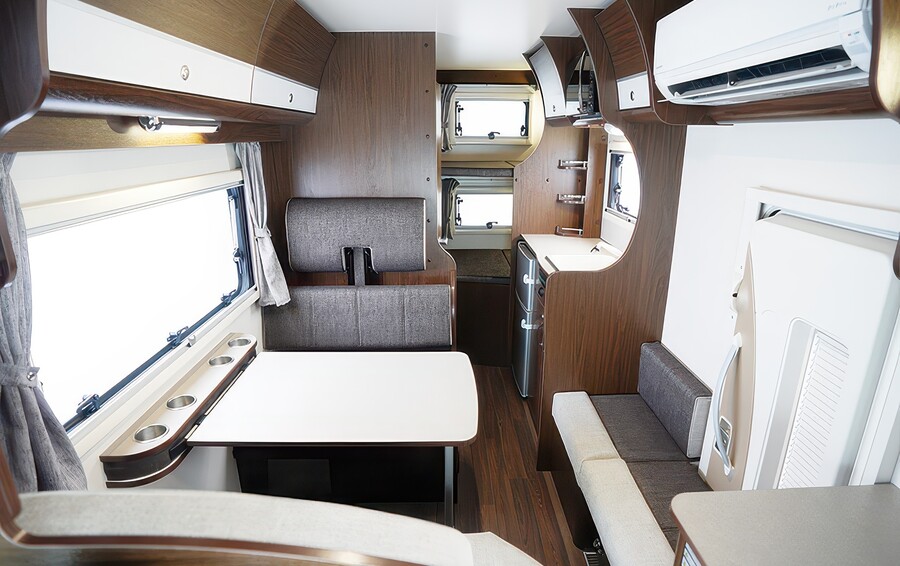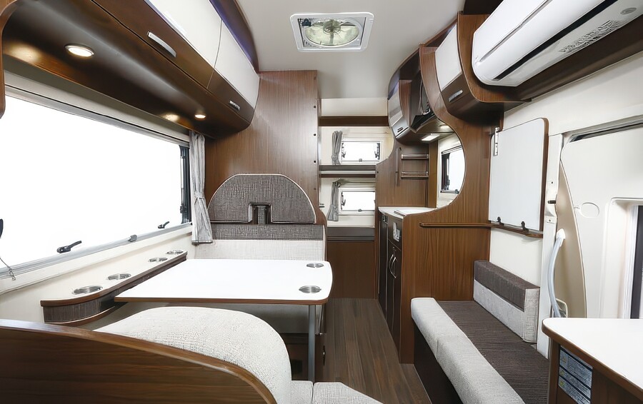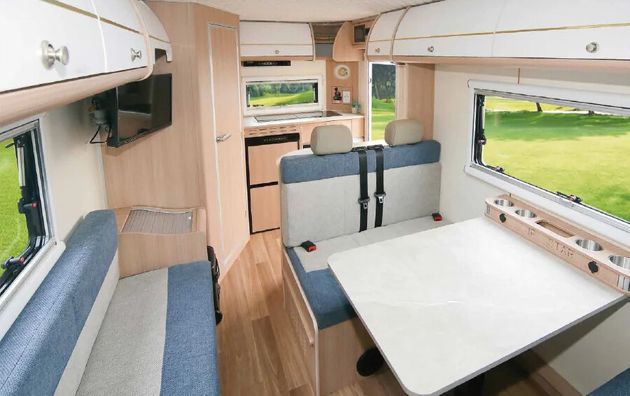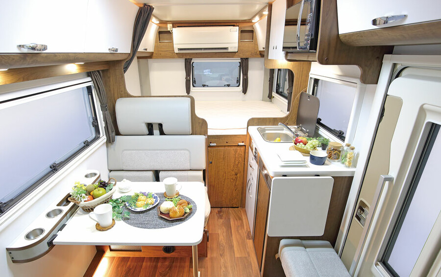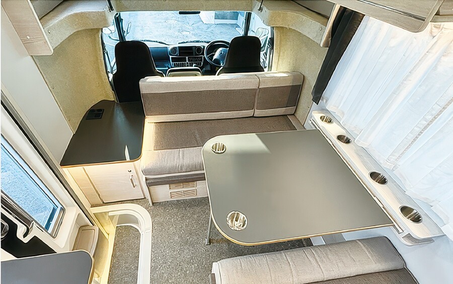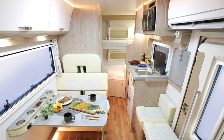 - 内装: 2人掛けマルチアクション式シートや脱着式折りたたみテーブルを備えたリビング。