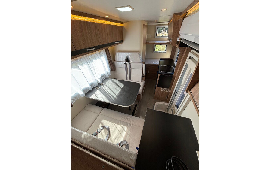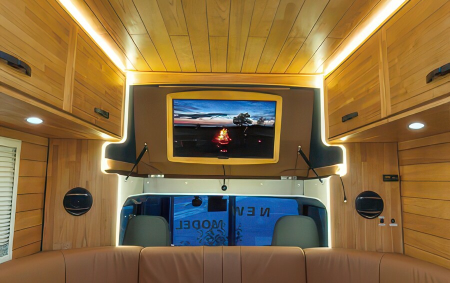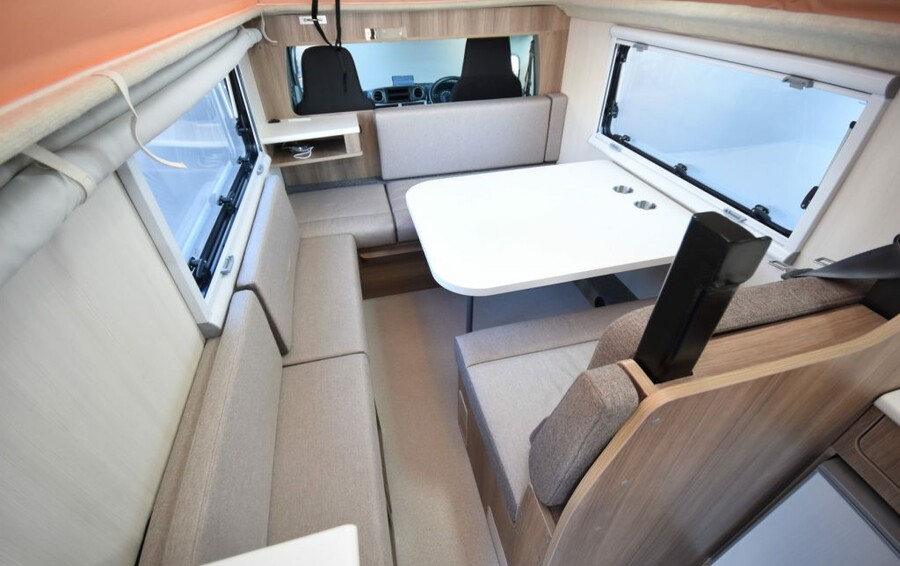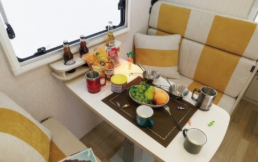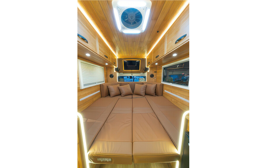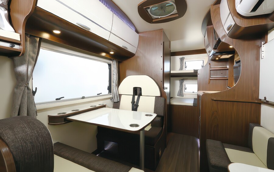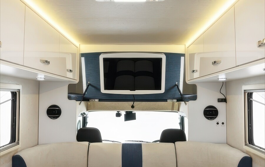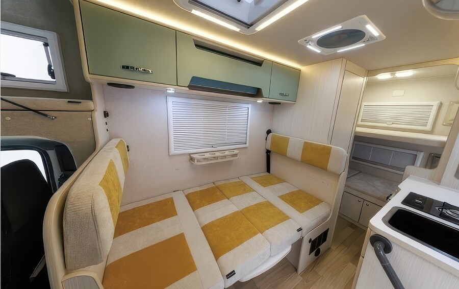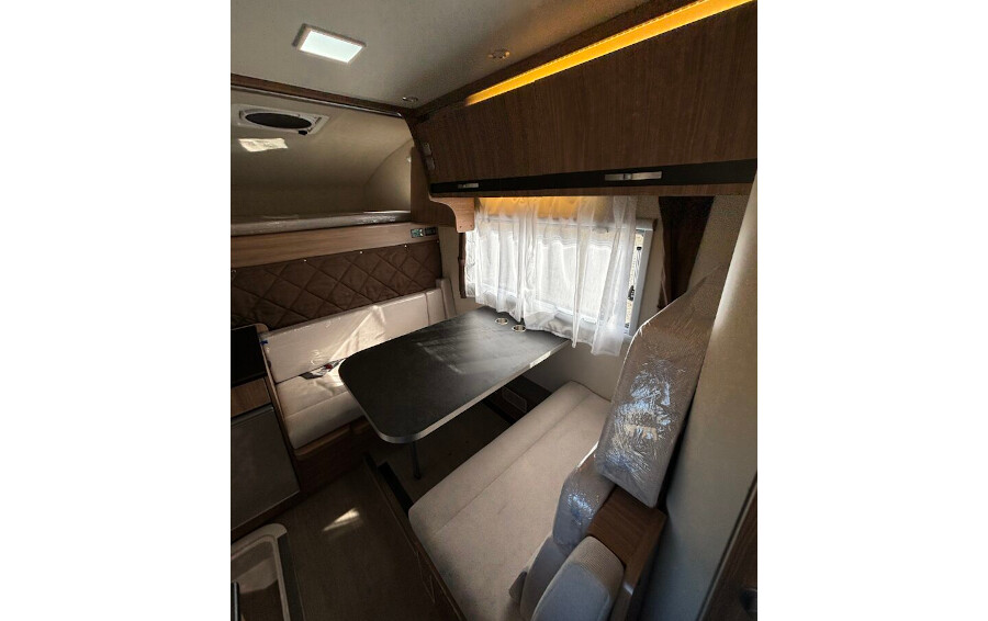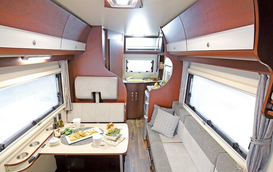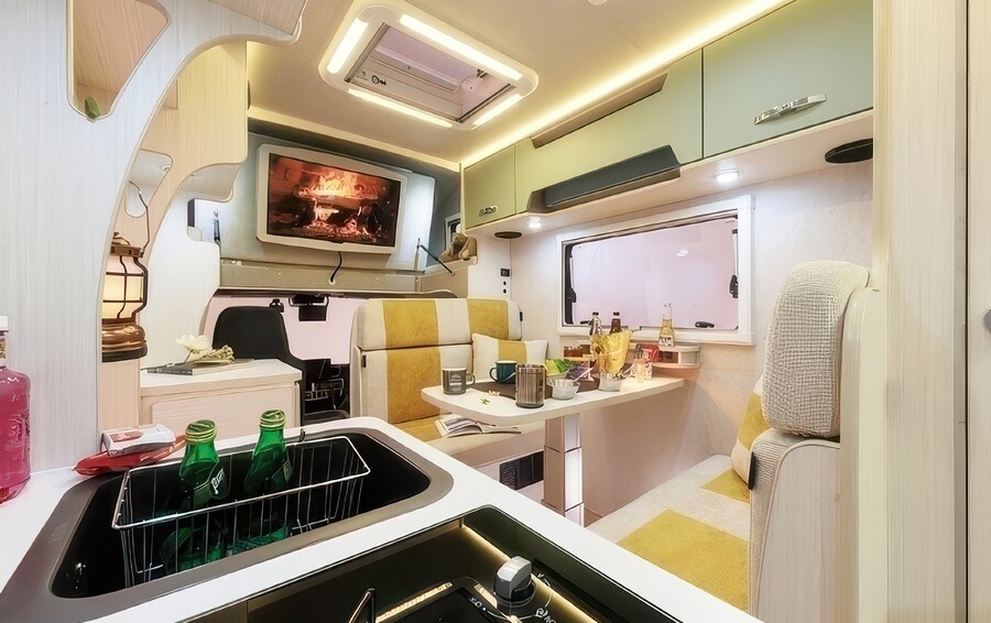- 内装: 2人掛けマルチアクション式シートや脱着式折りたたみテーブルを備えたリビング。