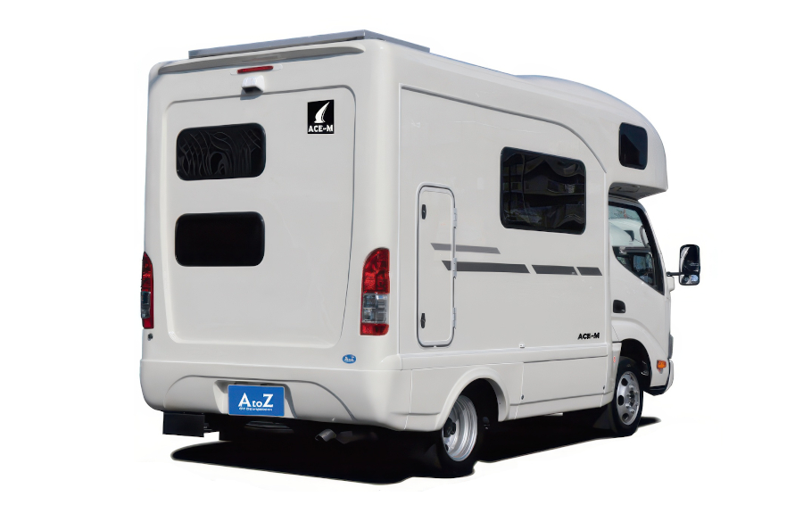 ACE-Mは、全長4.65mというコンパクトなボディサイズで、街中での取り回しや駐車がスムーズなAtoZのキャブコンです。トヨタ・カムロードをベースに、FRP高断熱ボディを採用。室内は「ファミリーでくつろげる」ことを重視し、4人が囲めるダイネットや大人4名+子供3名が就寝可能なスペースを確保しています。家庭用エアコンに匹敵する省エネ設計の12Vクーラー(KME製)、電子レンジ、49L冷蔵庫、200Ahサブバッテリー、1.5kWインバーターなどを標準装備し、手軽に本格的なキャンピングライフを楽しめます。