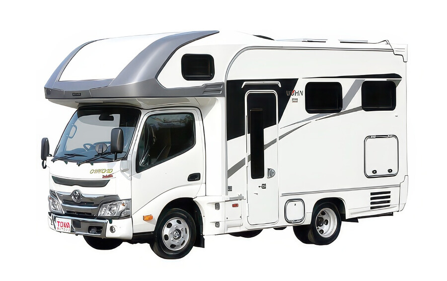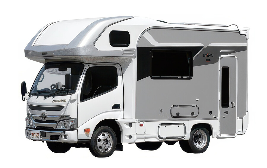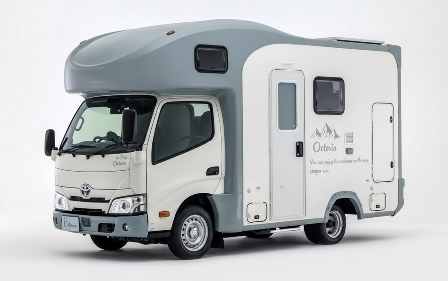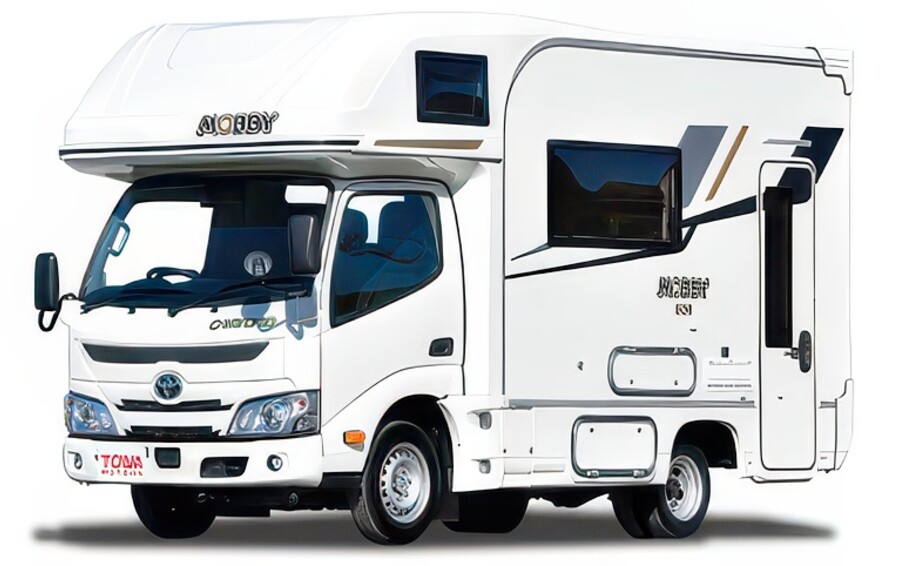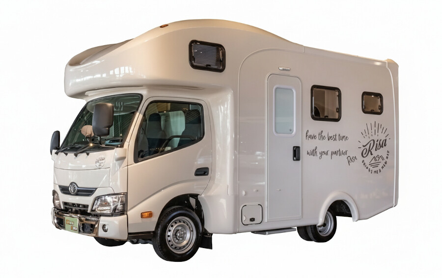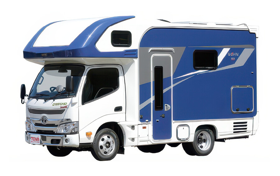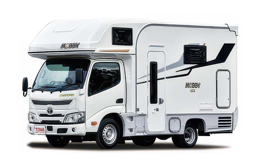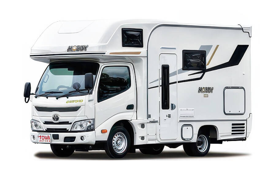 MOBBY(モビー)シリーズは、ハイエンドモデル「Whon(ヴォーン)」の技術を継承したコンパクトキャブコンです。全幅192cmというスリムな「ナローボディ」を採用しており、日本特有の狭い道路事情でも扱いやすい機動力を持っています。パネル構造には、欧州のキャンピングカーと同規格の35mm断熱材を使用した「高断熱コンポジットパネル」を採用し、軽量化と高い耐久性、断熱性を両立させています。車体部分にはトヨタ自動車の保証が付帯し、全国のトヨタ系ディーラーでメンテナンスが可能です。レイアウトは、リアエントランスのDC、常設二段ベッドのR2B、常設ダブルベッドのRWBの3タイプを展開しています。