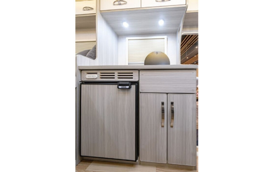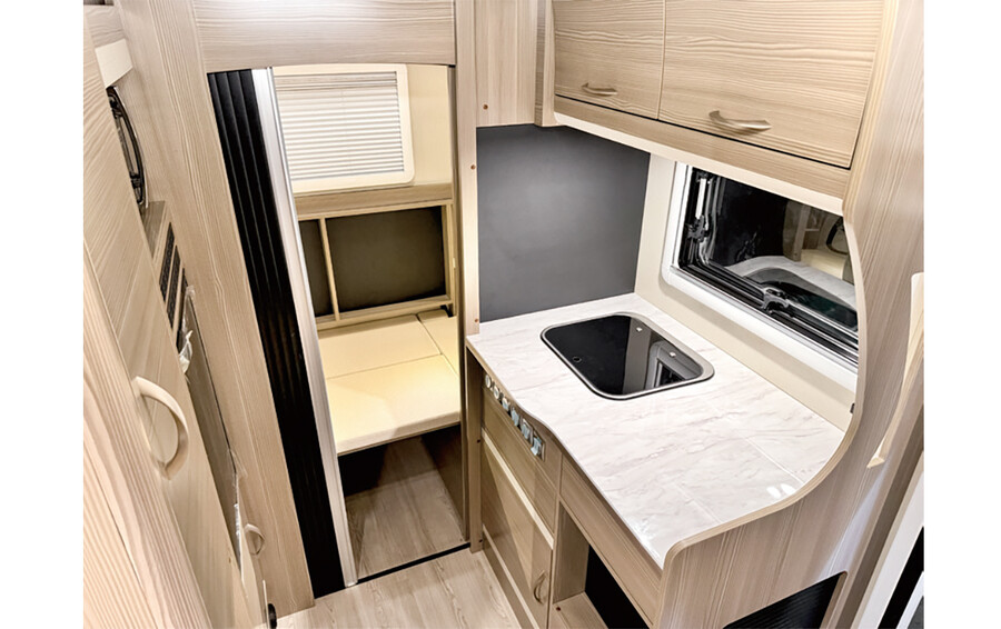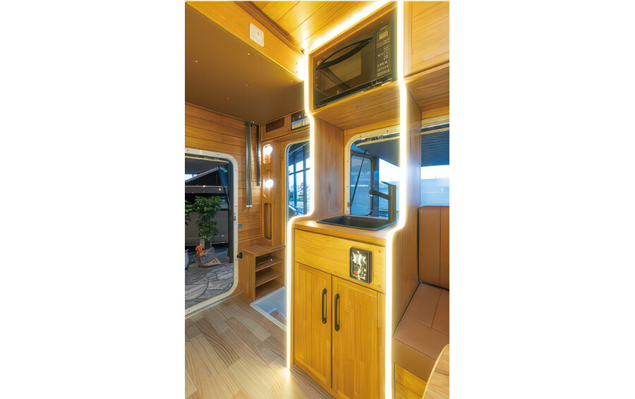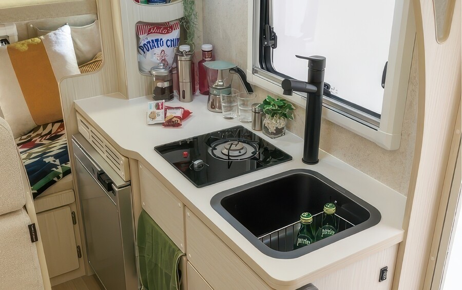 - キッチン: 60L冷蔵庫、電子レンジ、および外部シャワーとしても利用可能な引き出し式蛇口を備えた深型FRP製シンク。
