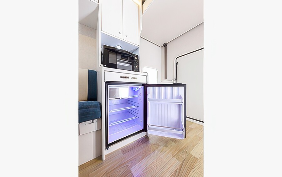 - キッチン: 49L冷蔵庫、電子レンジ、シンク、給排水各10Lタンクを備えた使いやすいキッチン。