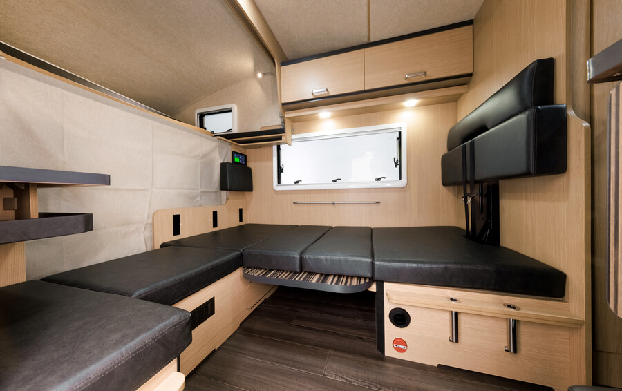 - バンクベッド: 走行安定性と収納力を重視したスタイリッシュな形状の収納庫兼ゲスト用バンクベッド。