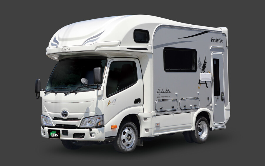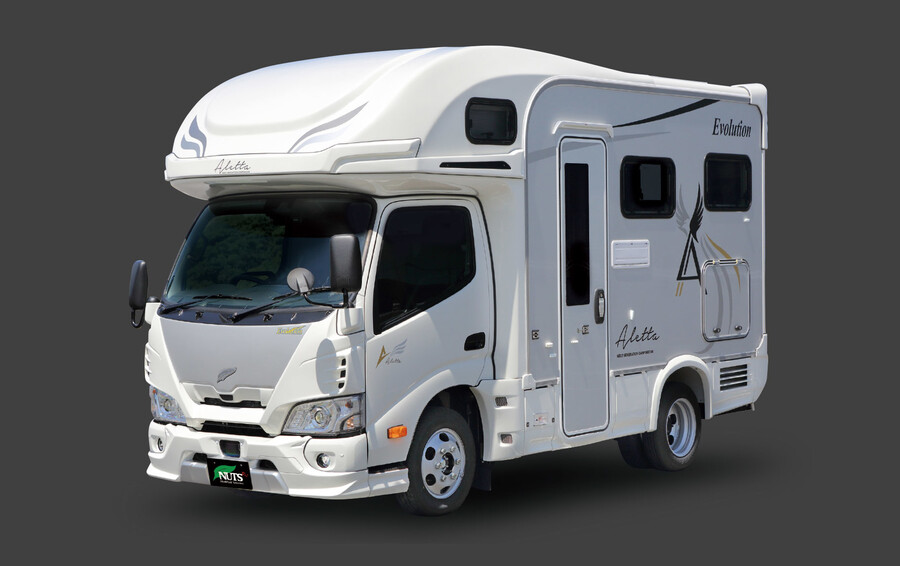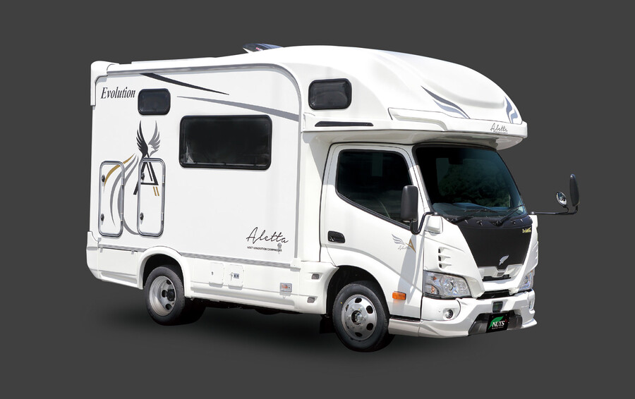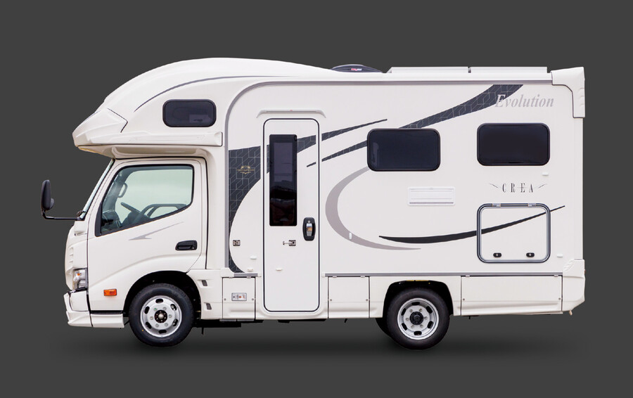 一般的な駐車場サイズ(5m×2m)に収まるスリムなボディサイズと、高断熱コンポジットパネル、エボライトシステムを搭載したキャブコンシリーズ