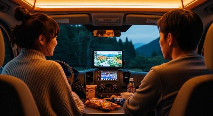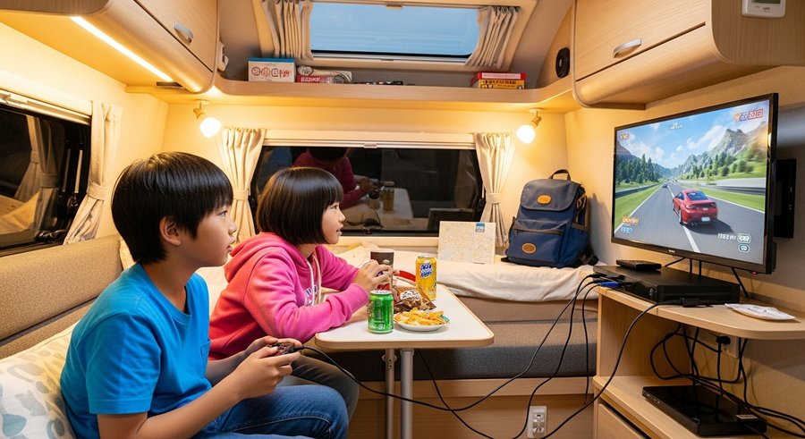 キャンピングカーにテレビを設置する最も大きな魅力の一つは、長時間の移動中や悪天候時でもエンターテイメントを確保できる点です。たとえば、お子さんとの長距離移動では、景色を見ているだけでは飽きてしまったり、渋滞に巻き込まれた際にストレスを感じたりすることがあります。テレビがあれば、好きな番組やアニメ、映画などを自由に楽しめるため、お子さんも大人も退屈せずに過ごせ、旅の快適度が格段に上がります。また、アウトドアを楽しむ計画をしていても、急な雨などで外に出られない状況に陥ることがあります。このような予期せぬ悪天候時でも、車内で映画やテレビ番組をゆっくりと楽しめるため、スケジュールが乱れても時間を持て余すことなく過ごせます。ゲーム機を接続して遊ぶことも可能であり、車内でのエンターテイメントの幅が広がります。