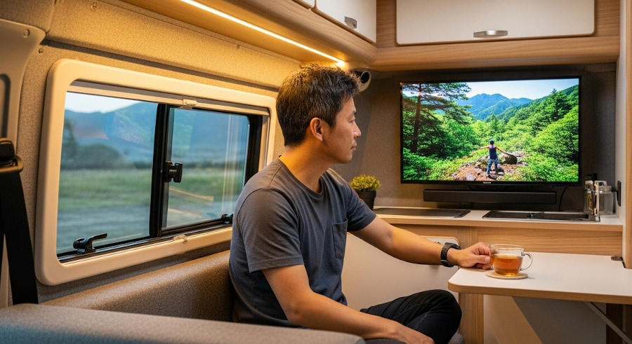家庭用テレビをキャンピングカーに本格的に設置することは、十分な知識と準備があれば素人でも可能です。テレビを壁にネジ止めしたり、モニターアームを使ったりする程度の設置工事はDIYで可能です。最近のテレビは省電力であり、モバイルWi-FiやFire TV Stickを活用すればアンテナ設置を不要にすることもできます。