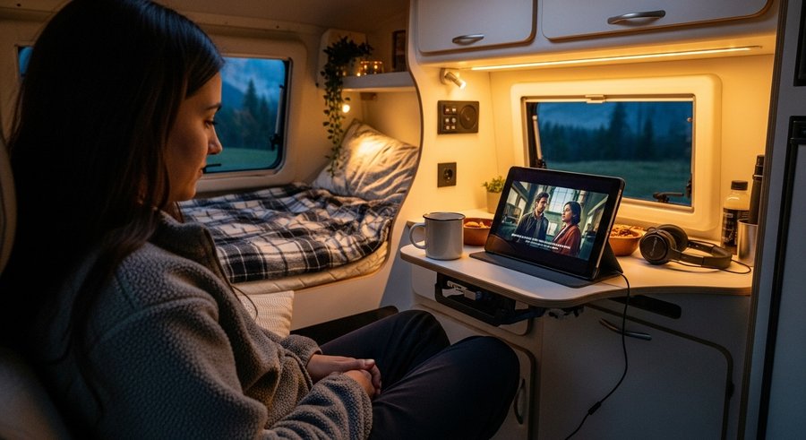 電波状況や通信環境に左右されずにテレビ視聴を楽しみたい場合、事前に録画した番組や映画をUSBメモリ、外付けHDD、SDカードに保存し、キャンピングカー内の再生対応テレビやメディアプレーヤーで再生します。BD/DVDプレーヤーを持ち込んでディスクを再生することも可能です。通信・電波不要で高画質のコンテンツを安定して楽しめますが、事前の準備が必要です。