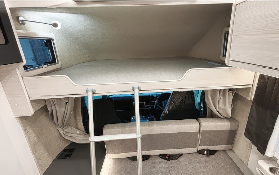 • ベッド: 2名就寝可能な跳ね上げ式バンクベッドと、後部常設2段ベッド。