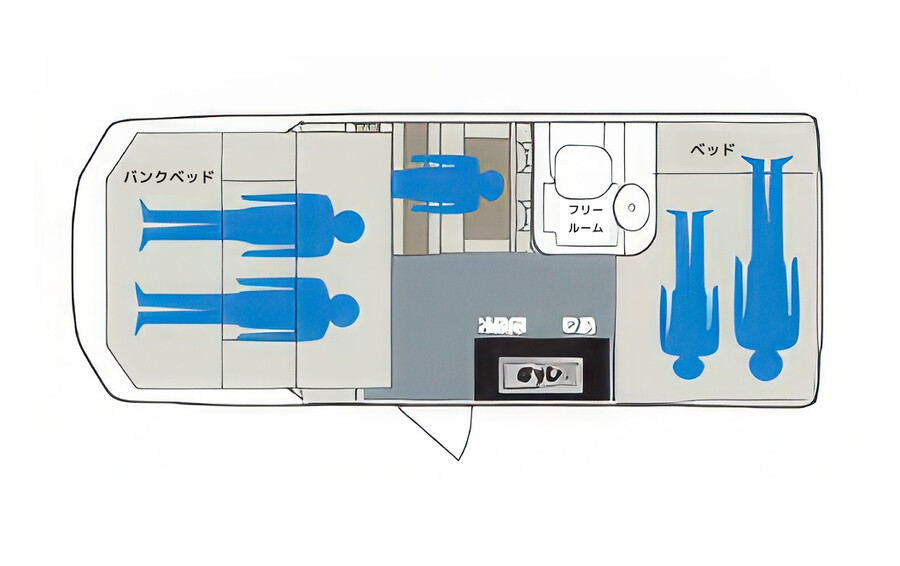 • ベッド: 幅1200mmのゆとりある後部常設セミダブルベッドと、開放感を重視した収納式バンクベッド。