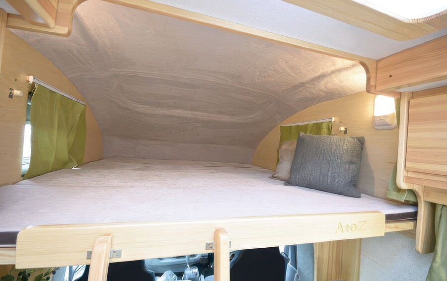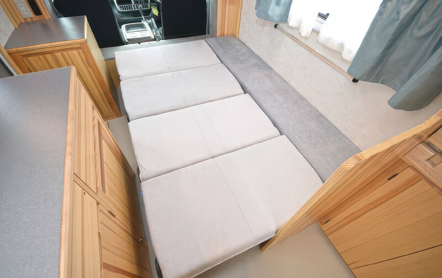 アクティブな旅を支える「大型リヤハッチ」と「巨大な荷室」が最大の特徴です。自転車などの大型ギアを積載でき、ハッチは雨天時の庇としても機能します。リヤベッドは格納式のため、荷室の広さを犠牲にせず、夜間は広い就寝スペースを確保できます。