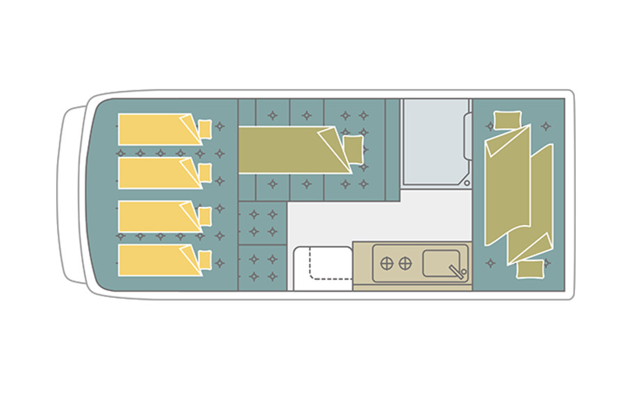 - 就寝設備: バンク、リア、ダイネットの3箇所。リア2段ベッドには読書灯と充電ポートを完備。