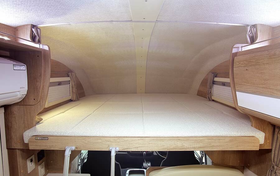 クラス最大の寸法を誇るセミダブルサイズ(1200mm幅)の二段ベッドを搭載した、究極のマルチレイアウトモデルです。リアの二段ベッドは、クラス初となる上下段ともウッドスプリングを採用しており、より快適な寝心地を約束します。5.3シリーズのため、冷蔵庫は115L、ソーラーパネルは560Wに強化されています。