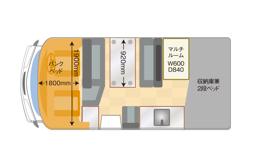 - リアベッド: 上下段ともにウッドスプリングを採用した幅1200mmの常設2段ベッド。