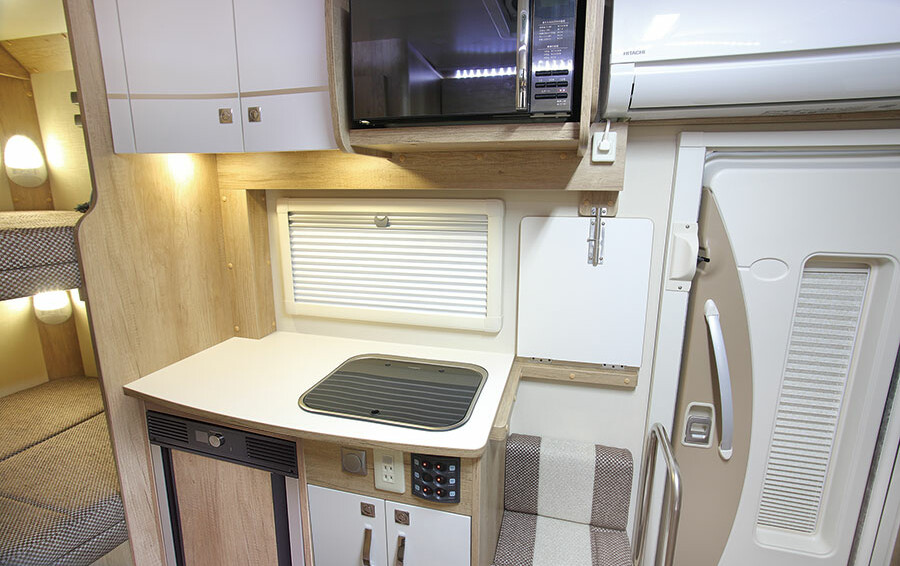 - キッチン: 一体式耐熱ガラス蓋付きシンク、2口ガスコンロ、電子レンジを備えたキッチンシステム。清水19L・排水19Lの給排水タンクを標準装備。