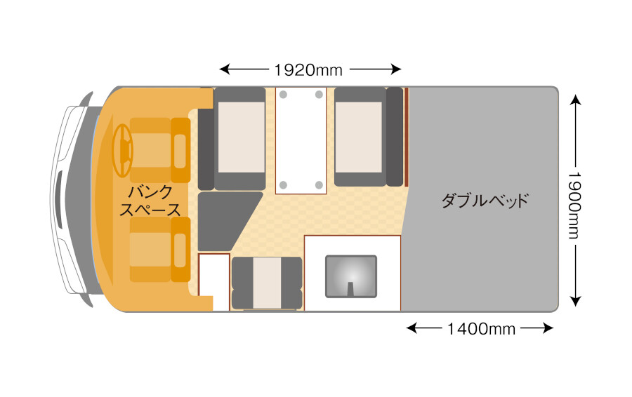 - バンクベッド: 圧倒的な開放感とクラス最大級の広さを誇るスライド式バンクベッド(高さ700mm)。