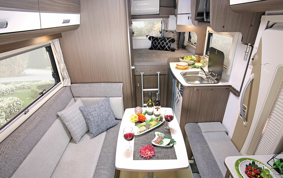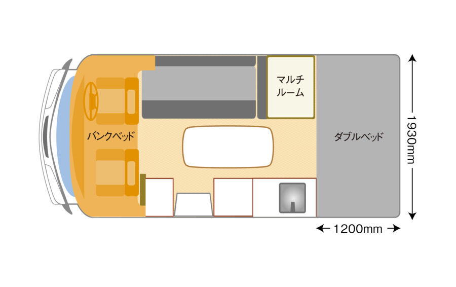 主に二人旅を想定した全長5m未満のレイアウトで、「ゆとり」と「癒し」を兼ね備えています。最大のセールスポイントは、常設セミダブル/ダブルベッド(1930×1200mmまたは1930×1400mm)で、専用マットレスとウッドスプリングが採用されています。ダイネットは横向きのロングソファ配置で、補助マット装着により5〜6人が対面で座れる広々空間を創出します。