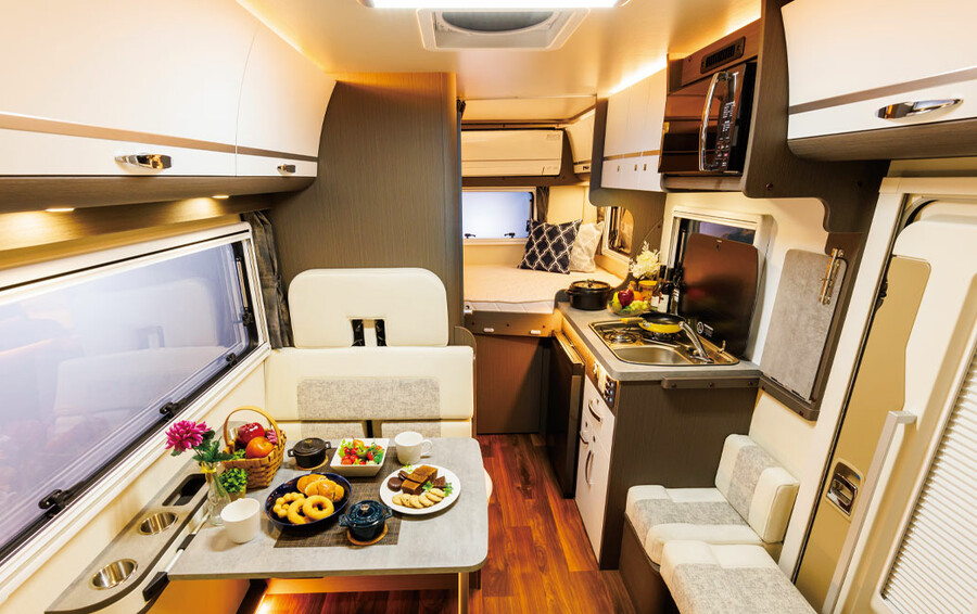 - キッチン: 一体式耐熱ガラス蓋付きシンク、2口ガスコンロ、電子レンジを備えたキッチンシステム。清水19L・排水19Lの給排水タンクを標準装備。