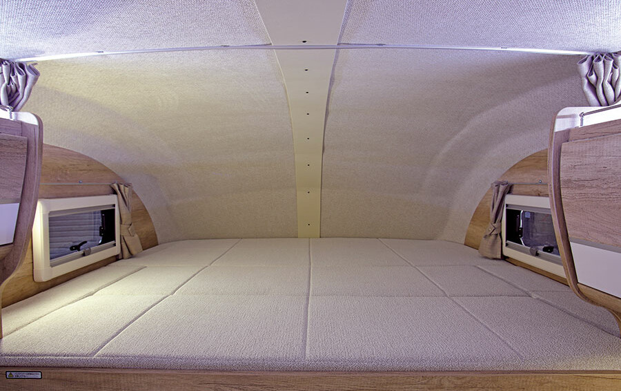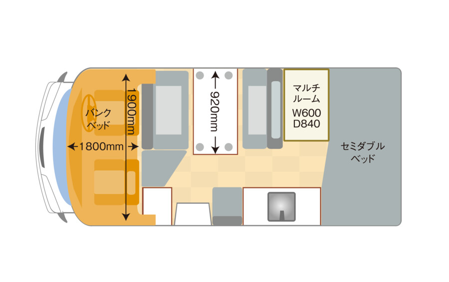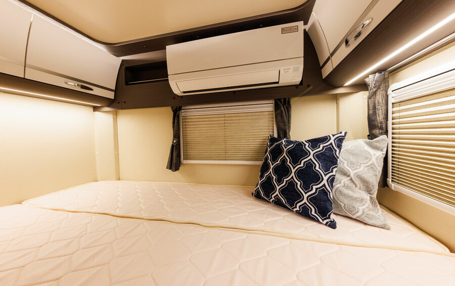 - リアベッド: ウッドスプリングを採用した幅1200mmの常設セミダブルベッド。