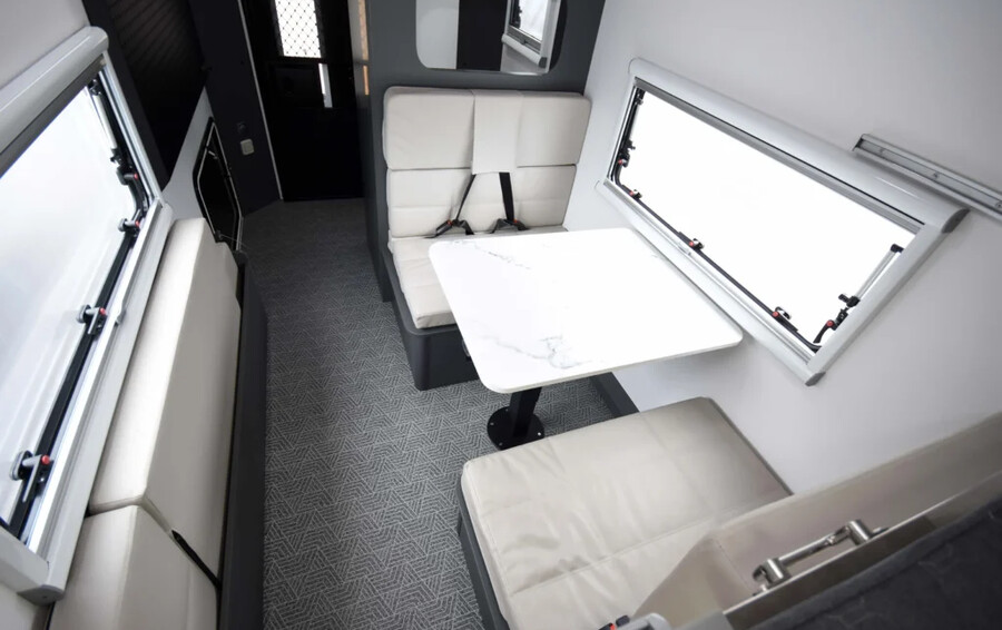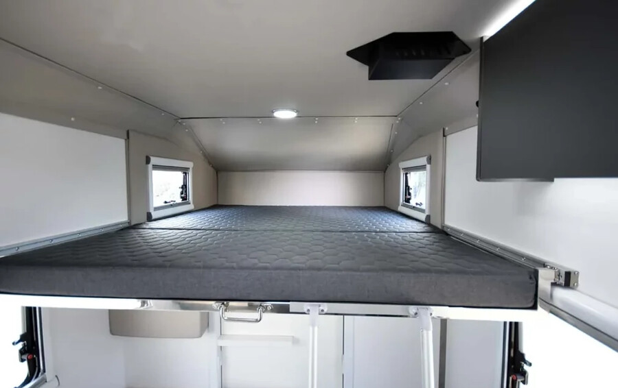 - バンクベッド: 上部に展開するスライド式の広々としたバンクベッド(ラダー付き)。