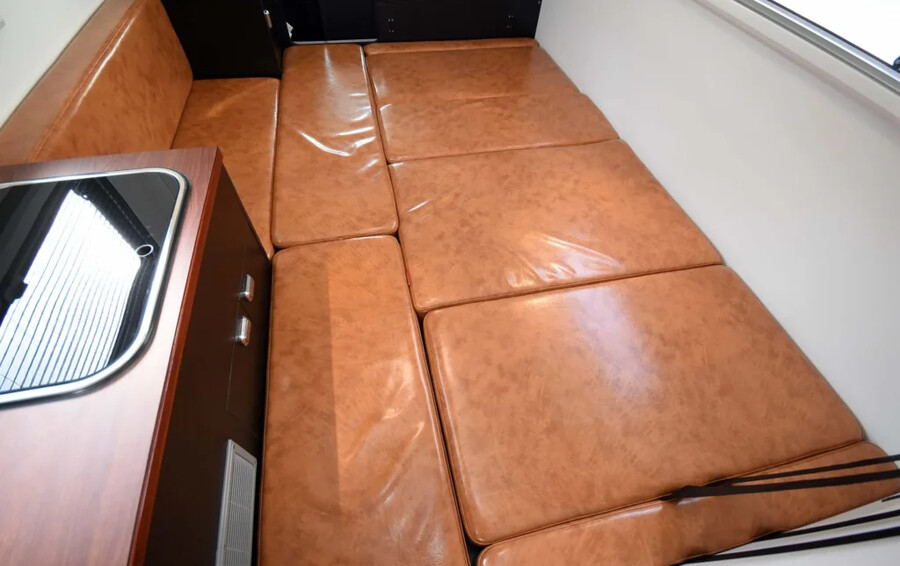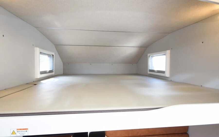 「HAYATE リアエントランスモデル」は、車両後部にエントランスを配置することで、対面シートとサイドベンチを組み合わせた開放感のある広々としたダイネット空間を実現したモデルです。ベースモデル同様にAT限定普通免許での運転が可能でありながら、こちらは最初から電装系と快適装備が大幅に強化されたハイグレード仕様となっています。特にリチウムイオンバッテリーやFFヒーター、カーナビなどが標準化されている点が特徴です。大人5人がゆったりと就寝でき、利便性と居住性を高次元で両立させています。