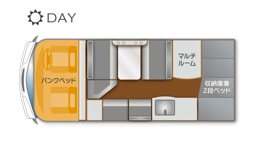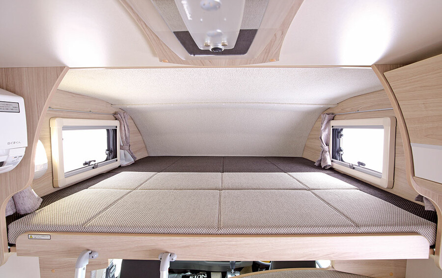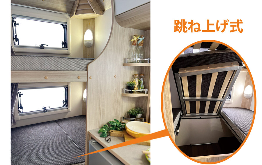 • 常設二段ベッド: 下段跳ね上げによる収納機能を備えた、業界初のウッドスプリング採用常設リア2段ベッド。