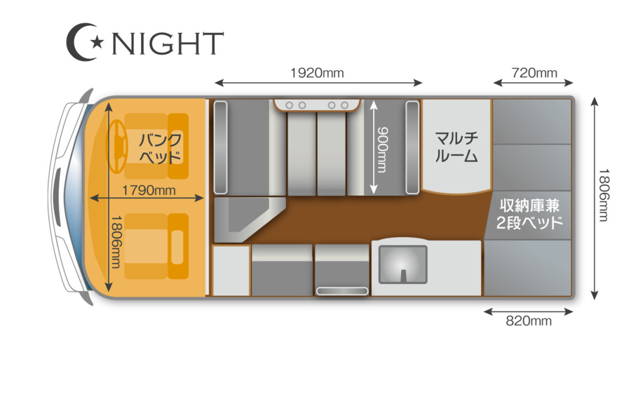 • バンクベッド: 大人2人が就寝可能な広さを確保した収納スライド式バンクベッド。