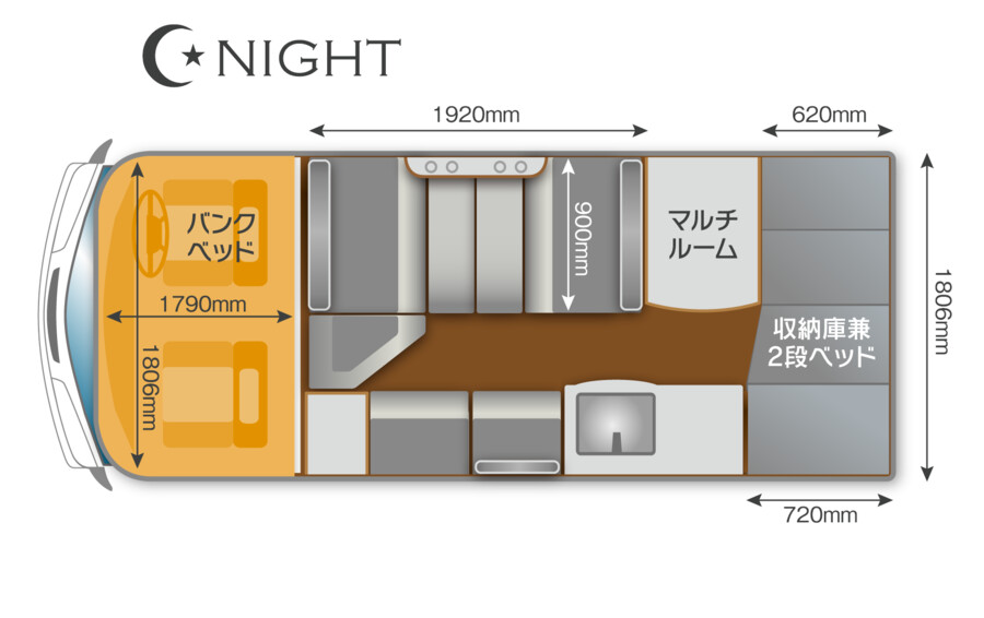- リアベッド: 幅180cm以上を確保し、快適な寝心地を提供するウッドスプリング採用の常設2段ベッド。