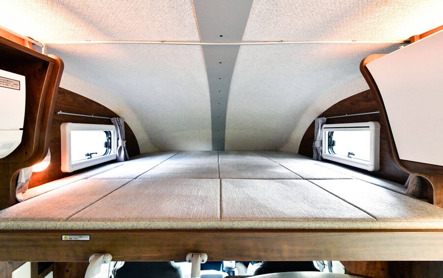 車両後部に大型のダブルベッドを配置することで、室内に圧倒的な開放感とゆとりを生み出したレイアウトです。
