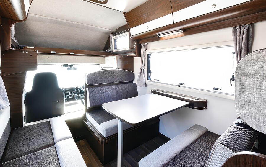 全幅192cmのスリムボディに、リアエントランスと広いリビングを配置した「DC」モデル。家庭用エアコンやトリプルサブバッテリーを標準装備し、高い機動性と快適な居住性を両立。