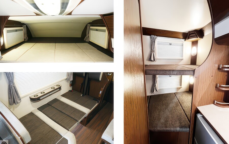 - ベッド: 後部に配置された常設二段ベッドと、アルミラダー付きスライド式バンクベッド。