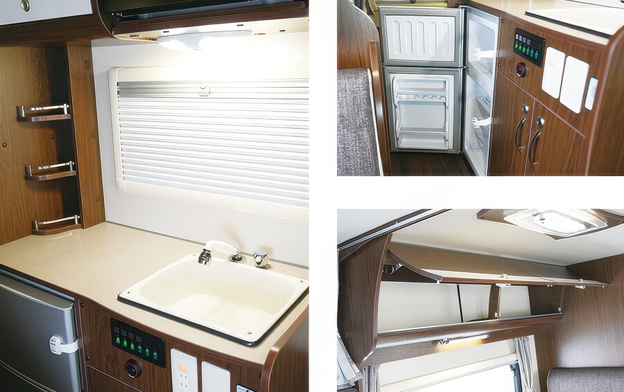- キッチン: 車外利用も可能なシャワーフォーセット付きシステムシンクとカセットガスコンロ。