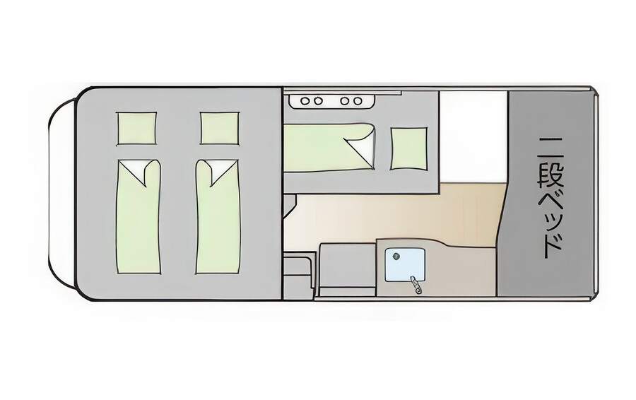 R2Bモデルは、車両後部に常設の二段ベッドを備えた、ファミリーやグループに最適なレイアウトです。全幅192cmのコンパクトな車体ながら、二段ベッド、スライド式バンクベッド、ダイネットベッドを合わせて計5名の就寝スペースを確保しています。リビングスペースは対面シートに加え、エントランス横に補助マットを設置することで、最大6名が団欒できる空間に広がります。また、リアには大型のフリールームを備えており、キャンプギアの収納やオプションのトイレ設置など多目的に活用できます。