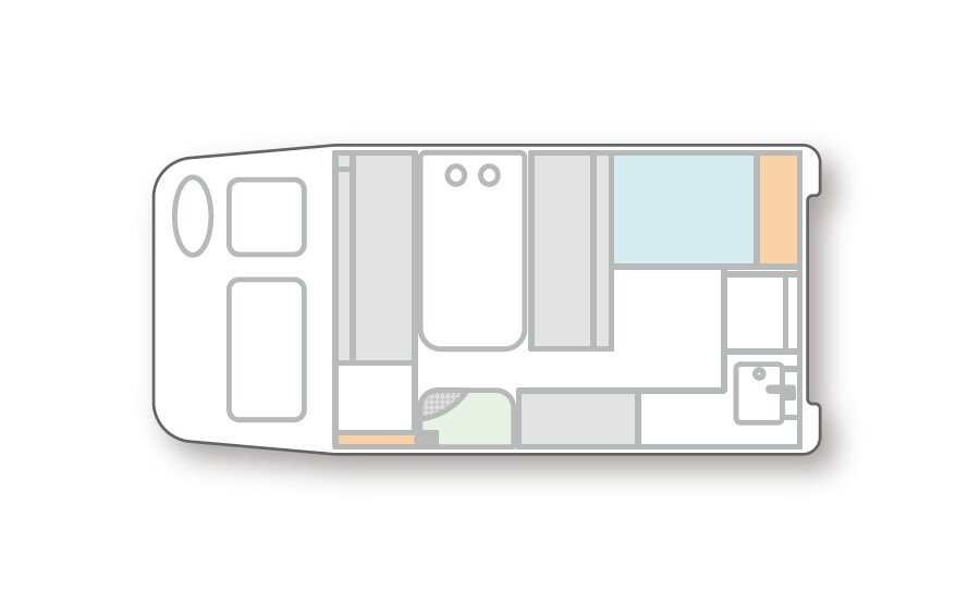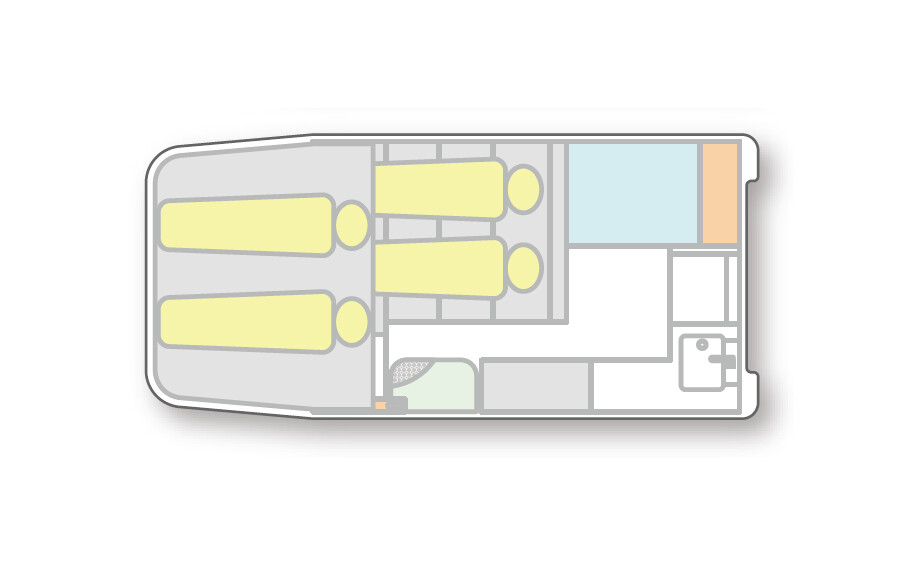 - ベッド: 大人2名が就寝可能な両側跳ね上げ式バンクベッドおよびダイネット展開ベッド。