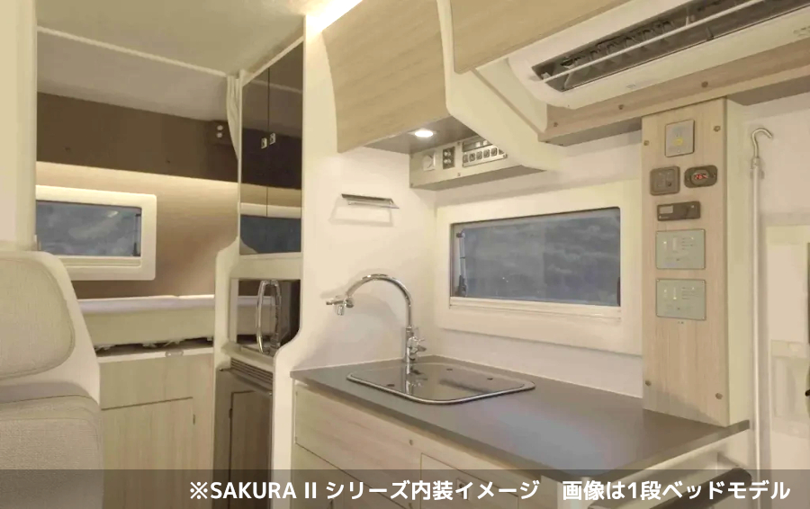 「SAKURA」シリーズは、いすゞ自動車がキャンピングカー専用に開発したフラッグシップシャシ「Be-cam(ビーカム)」をベースにした、日本特種ボディー(NTB)の主力モデルです。ベース車両は、小型ディーゼルトラックでトップクラスの燃費性能を誇るいすゞエルフのハイキャブ2.0t車に、キャンピングカー専用の設計変更を施しています。9速AMT「ISIM」や全輪ディスクブレーキを採用し、重量が増えがちなキャンピングカーでも確実な制動力とスムーズな走行、高い高速安定性を実現しています。また、全国のいすゞサービス工場で点検整備が可能であり、長距離の旅における安心感も大きな特徴です。SAKURA IIは、電装系も充実しており、標準で家庭用エアコンや大容量の800Wソーラーパネル、鉛蓄電池を安定させるウルトラキャパシターが搭載されています。レイアウトは1段ベッド、2段ベッド、ダブルベッド、ワイドベッド、リアエントランスの5種類に加え、セミオーダーやフルオーダーも選択可能です。