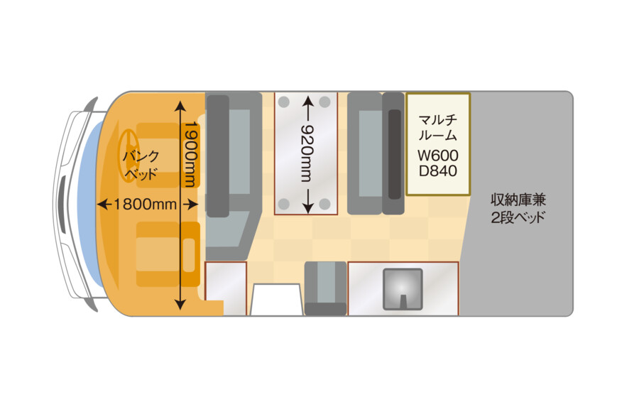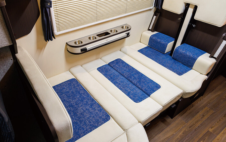 • バンクベッド: 走行安定性と収納力を重視したスタイリッシュな形状のバンクベッド(高さ500mm)。