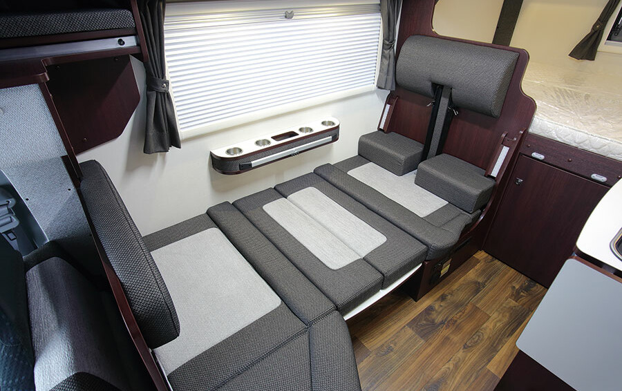 マルチルームを必要としないユーザーのために、マルチルームを排した「開放感」と「クラス最大級の大型収納スペース」を特徴とするレイアウトです。リヤベッドは一般のダブルベッドと同じサイズ(1930×1400mm)の常設ベッドで、専用マットレスとウッドスプリングが標準装備されています。