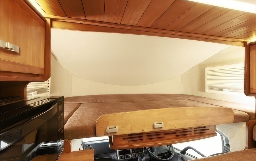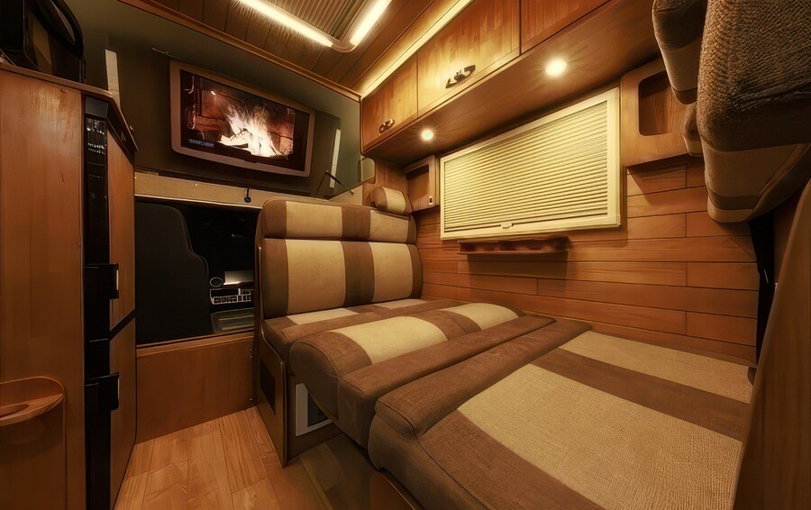 規則的な木のテクスチャーをふんだんに使用し、ログキャビンを彷彿とさせるリアルウッドに囲まれた空間が特徴です。下地からウッドを採用する工法により、収納棚の内部まで壁と同じ木材が使用されており、木に包み込まれるような心地よさと高級ホテルにいるような感覚を提供します。レイアウトはリビングエリアの後ろに常設セミダブルベッド、その横にマルチルーム、エントランス横にキッチンエリアを配置しています。