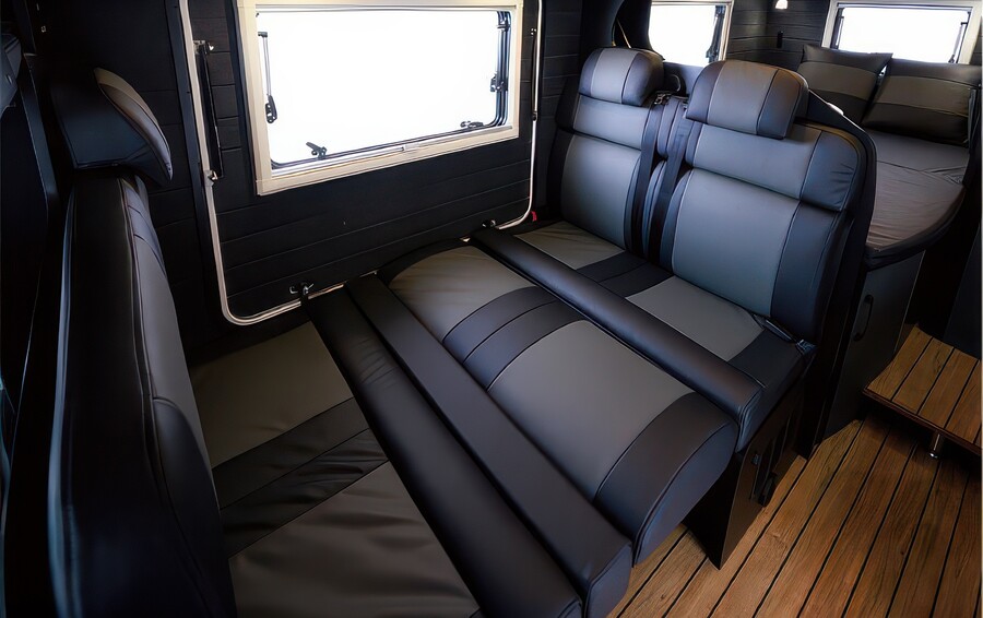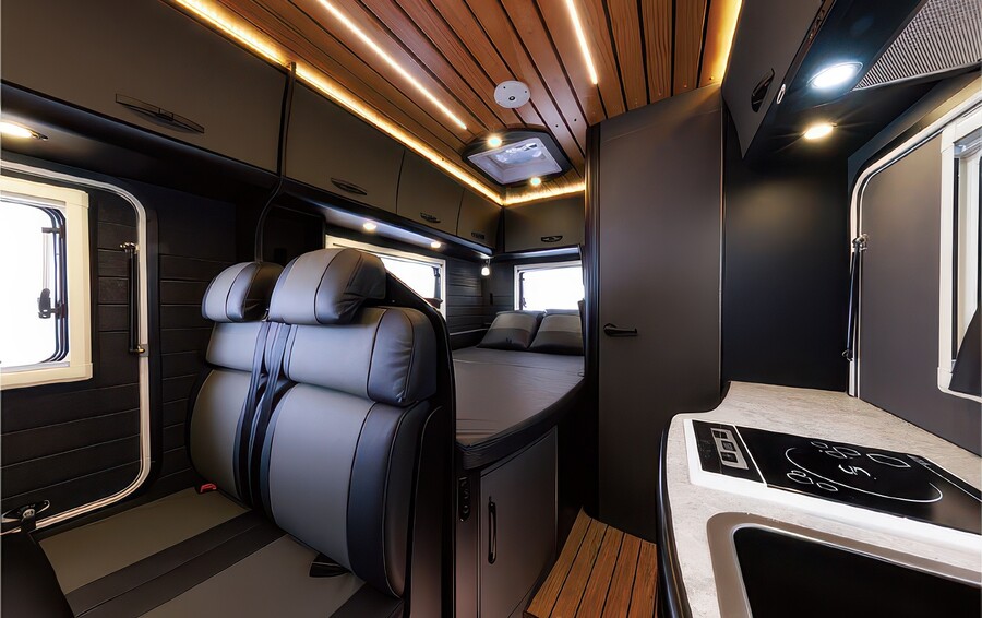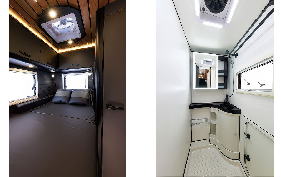 落ち着いた上品なインテリアと、ダイナミックなアウトドアフィールドへスムーズにつながる空間の融合が特徴のフラッグシップモデルです。両サイドに取り付けられた大きく開くゲートにより、室内にいながら外の風を感じられるボーダレスな感覚を提供します。リアには常設ダブルベッドと広々としたバスルーム(マルチルーム)を配置し、大型冷蔵庫や充実した電源システムを備え、長期の旅でも快適に過ごせる最上級の設備が整っています。