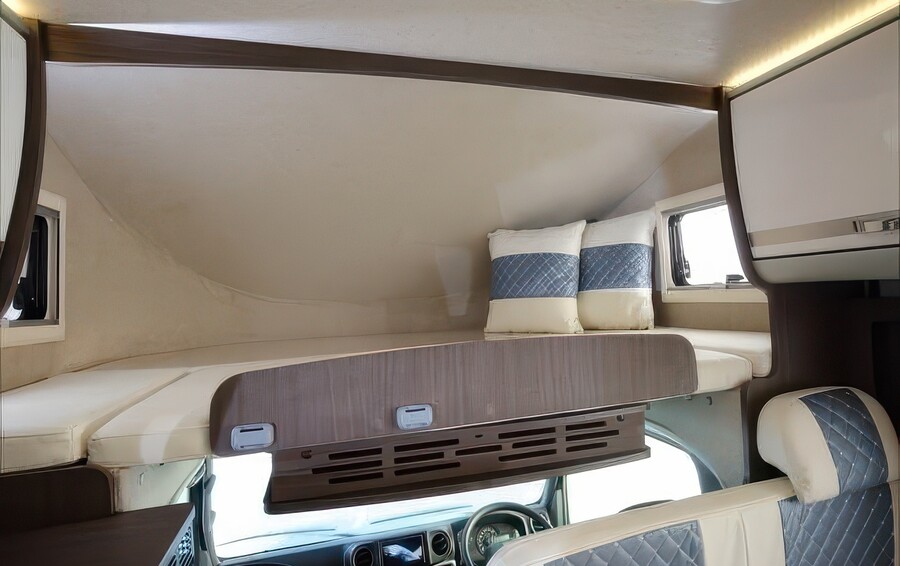 トヨタ・カムロードをベースに運転席より後方すべてをオリジナルで架装したモデルです。対面対座のセカンド&サードシートによるダイネット展開や、リアベッドのテーブルでの食事、バンクベッド跳ね上げ時の32インチ大型テレビなど、快適かつ開放的なインテリア空間が特徴です。マルチルームには温水シャワーとトイレを完備し、災害時の居住スペースとしても十分な機能を備えています。