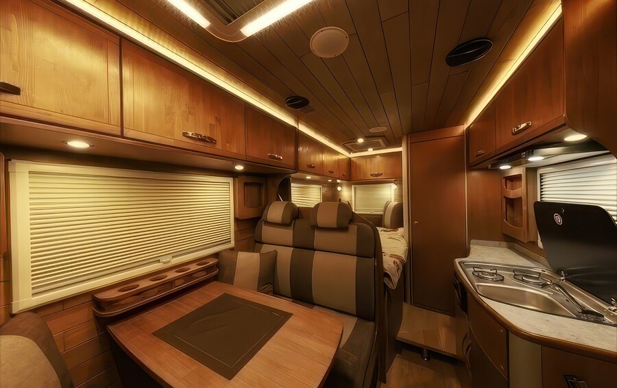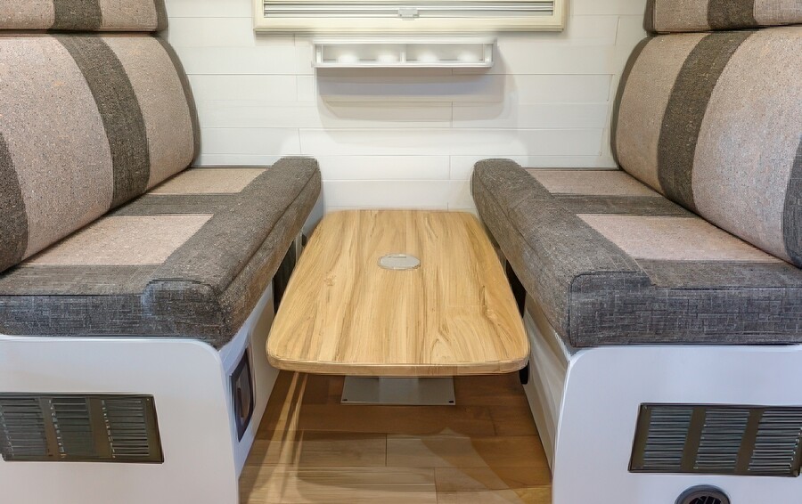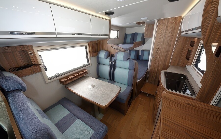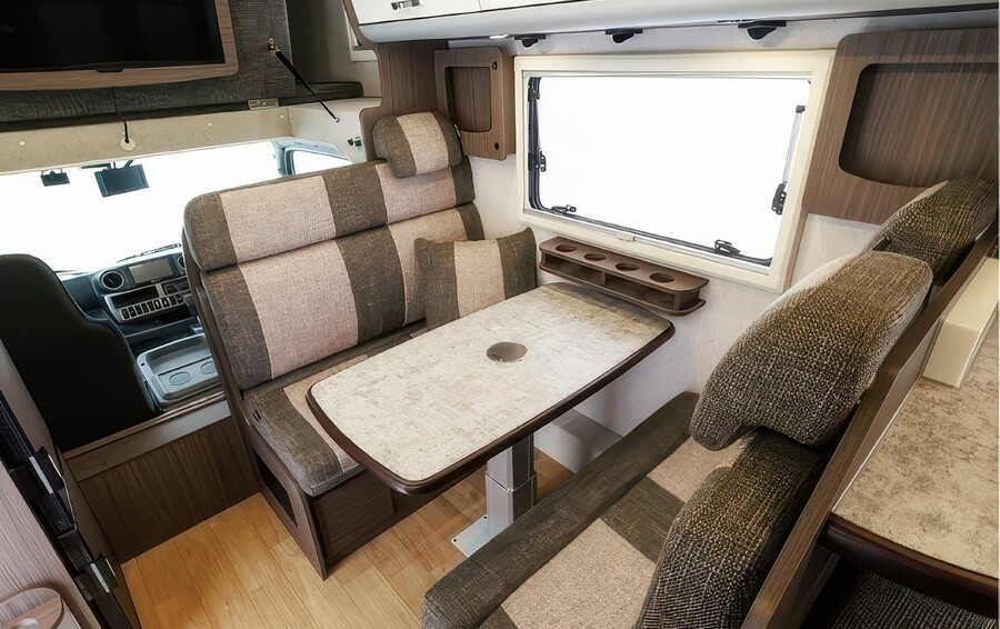 - PREMIUM MEGA(Ⅱ) センターダイネットとリア2段ベッドを採用。多人数での利用と快適な就寝スペースを確保しています。