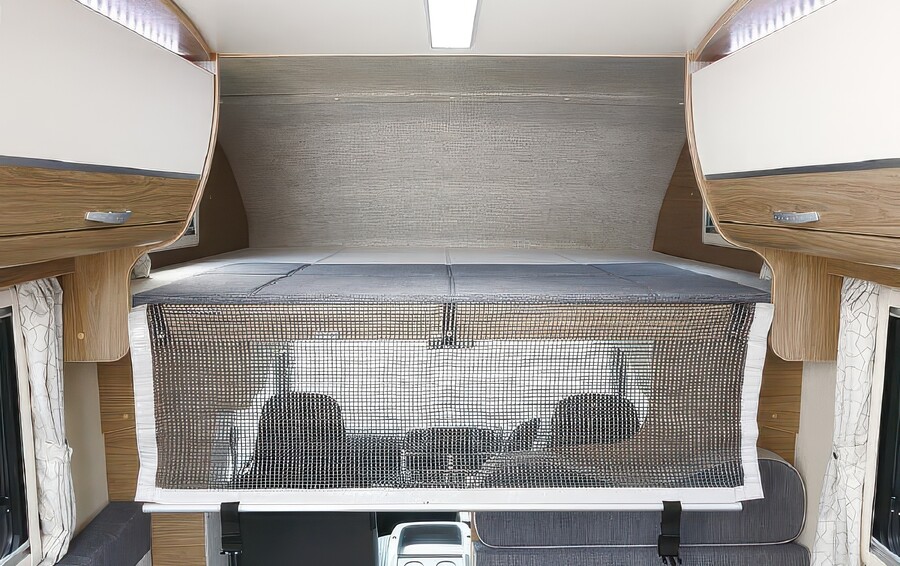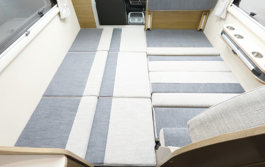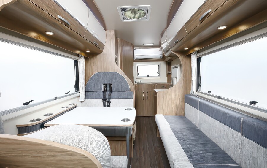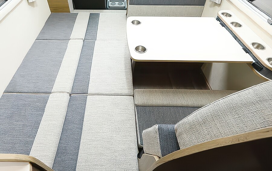 レイアウトや基本性能は2WDモデルと同様、リアエントランスによる広々としたリビングが最大の特徴です。4WDモデルは雪道や悪路での走行安定性が高く、四季を通じてアクティブに旅を楽しむユーザーに適しています。中央のダイネットは、3分割のサイドカウチソファーと対面シートの組み合わせにより自由なレイアウト展開が可能です。