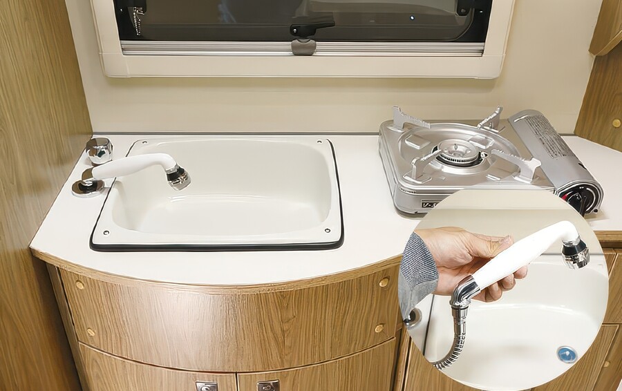 - 給排水: 清潔で耐久性の高い各60Lのステンレス製清水・排水タンク。