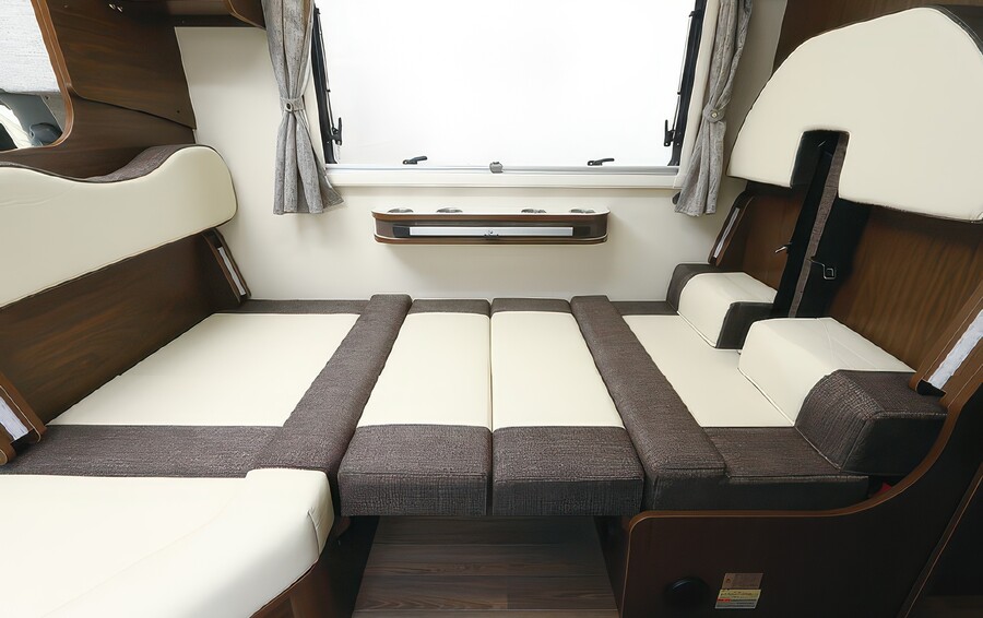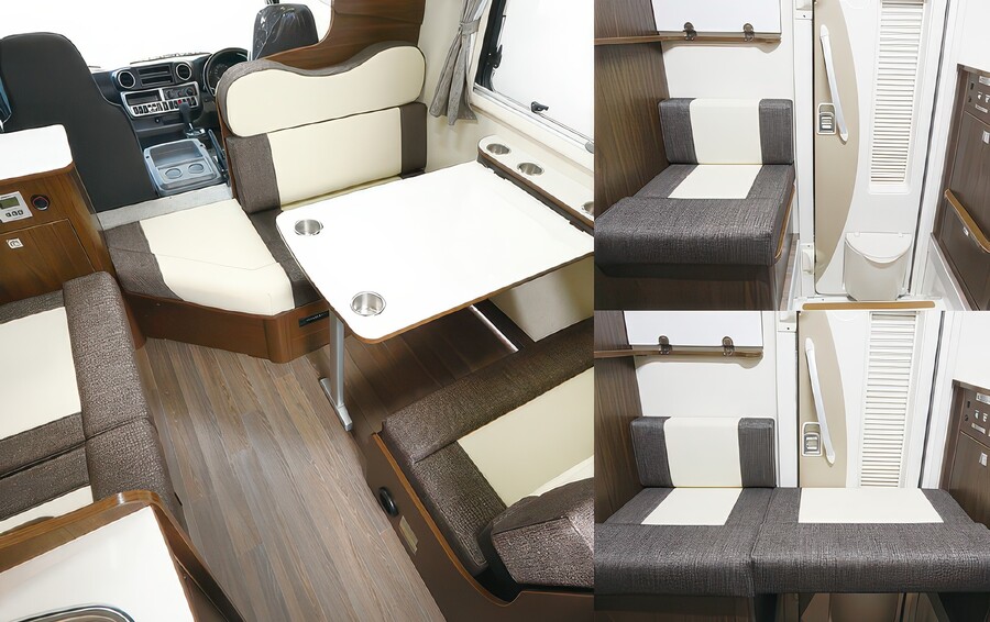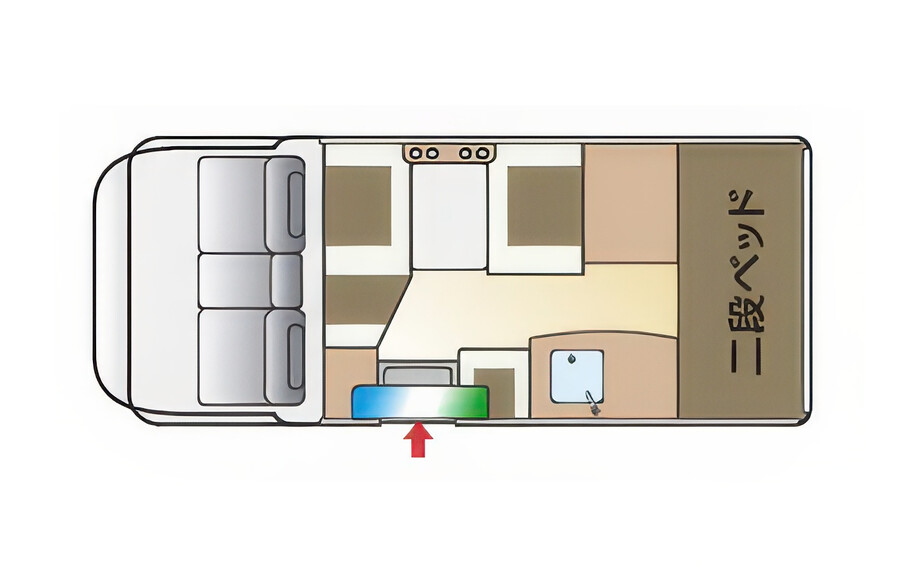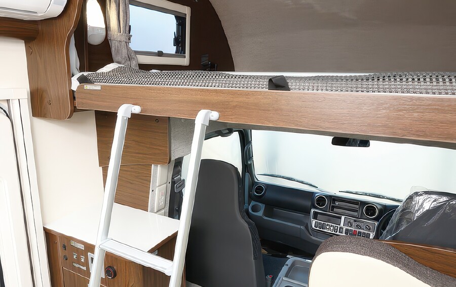 リチウム400Ahと急速充電システムを搭載した最上級モデル。幅広の常設2段ベッドでゆとりの就寝スペースを確保。