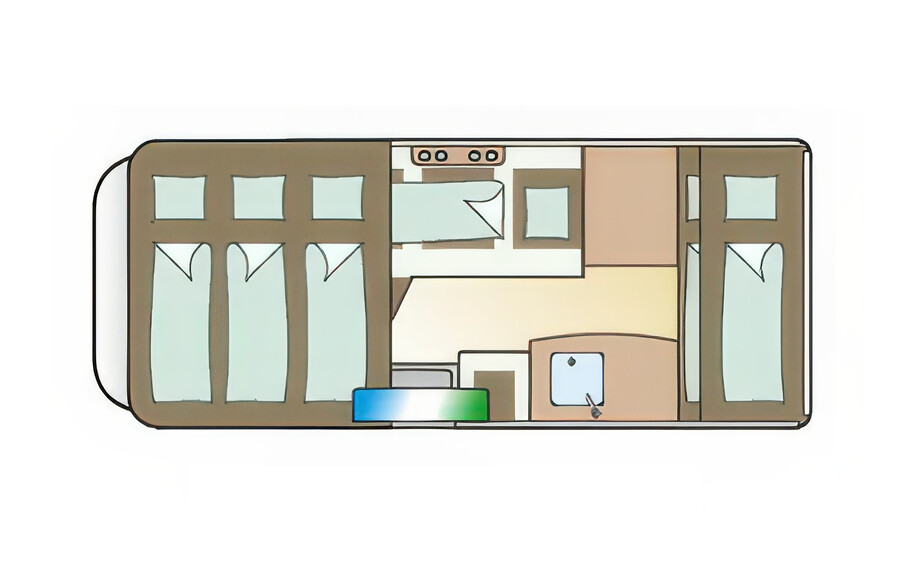 • 外部収納: 二段ベッド下に広大な収納スペースを備え、大きな荷物の積み込みに対応。
