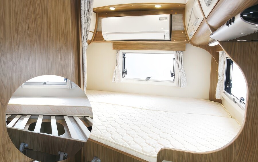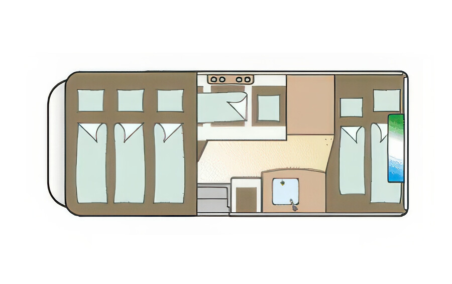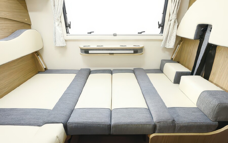 ウッドスプリング採用の常設ダブルベッドを備えた、二人旅にも最適な最上級モデル。3方向からアクセスできる巨大収納も魅力。