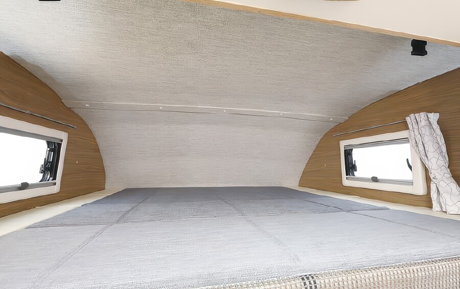 車体後部に大型常設セミダブルベッドを採用し、ホテルのような上質な睡眠を追求した大人向けのハイグレードモデルです。ベッドにはウッドスプリングと専用マットレスを配置し、旅先でも最高の寝心地を提供します。ベッド下は3方向からの外部アクセスが可能な「超大型外部収納庫」となっており、室内からも荷物を取り出せる便利な設計です。電装面もフラッグシップ共通のリチウム400Ahシステムを搭載しています。