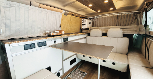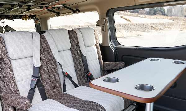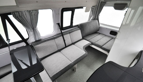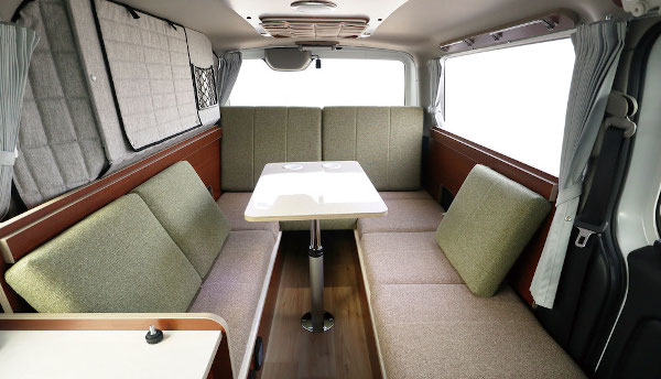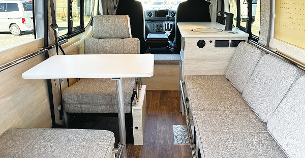 - 多機能ソファベッド: 車内の中心には3人掛けの多機能ソファベッドが配置されています。このソファは座り心地が良く、展開することで大人2名が快適に眠れる広さのベッドへと変わります。シートやテーブルのアレンジ次第で、リラックスチェアとしても活用できる柔軟性を持っています。
