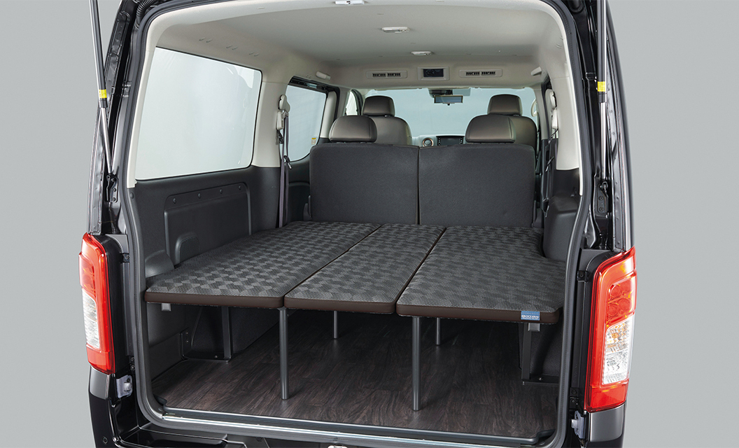 キャラバン マルチベッドの核となるのは、その多機能なベッドシステムです。荷室スペースに備え付けられたベッドは、左右に跳ね上げて収納することが可能であり、使用しないときには広大な荷室空間を確保できます。また、ベッドは左右独立して使用できるほか、荷室全体に展開して広い就寝スペースを作り出すことも可能です。