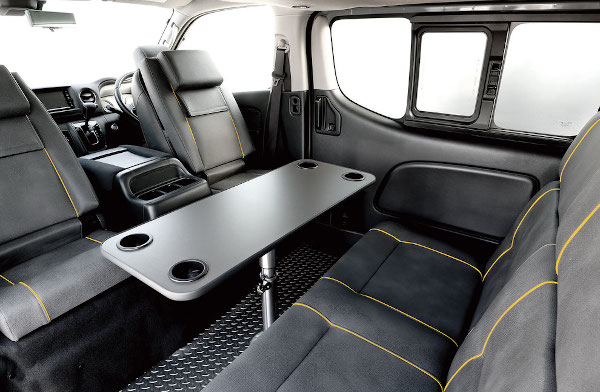 このモデルの核となるのが「マルチベッドシステム」です。荷室スペースに備え付けられたベッドは、左右に跳ね上げて収納することが可能で、左右独立した状態での使用や、荷室全体に展開することもできます。ベッドの下には広い収納スペースを確保し、趣味の道具などを積むことも自由自在です。また、メーカーオプションで高さ調整可能な脱着式テーブルを追加すれば、簡易的なリビングとしても活用でき、食事や作業を快適に行うことができます。このテーブルは取り外しも可能で、就寝時の妨げになりません。
